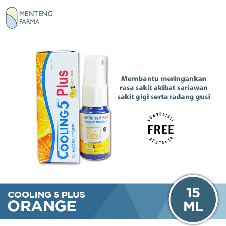 Cooling 5 Plus adalah obat semprot (spray) antiseptik dan anestesi lokal mulut yang digunakan untuk menghilangkan rasa sakit dengan cepat. Obat ini bekerja dengan cara memberikan efek mati rasa (baal) pada area yang disemprotkan, sehingga nyeri tidak lagi terasa untuk sementara waktu.