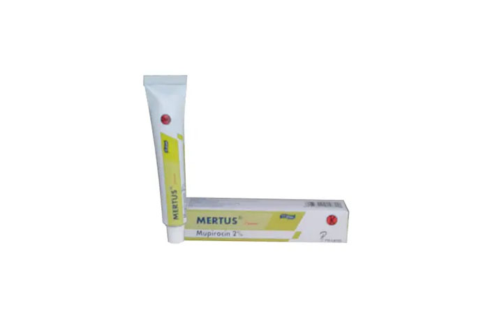 Kandungan Mupirocin dalam Mertus bekerja dengan cara menghambat sintesis protein bakteri. Secara spesifik, zat ini mengikat enzim isoleucyl transfer-RNA synthetase, sehingga bakteri tidak dapat berkembang biak dan akhirnya mati.